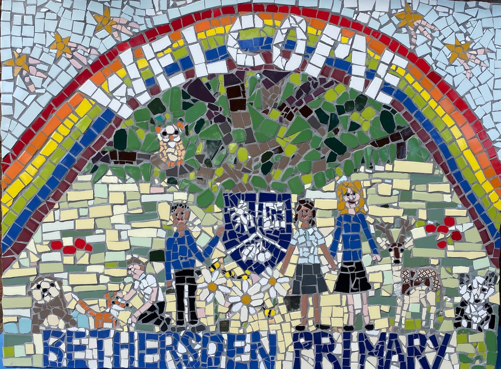 A stunning mosaic piece that stands at 1.8 metre tall, created with year six primary schoolchildren to grace the new building at Ladbroke JMI school in Potters Bar. This was an amazing and highly creative project using not only a huge array of tiles but also vintage crockery. A beautiful tree and six schoolchildren were recreated in tile, showing the school uniform in all its different varieties. The word ‘Welcome’ was written in rainbow lettering to remember the sense of community during Covid.