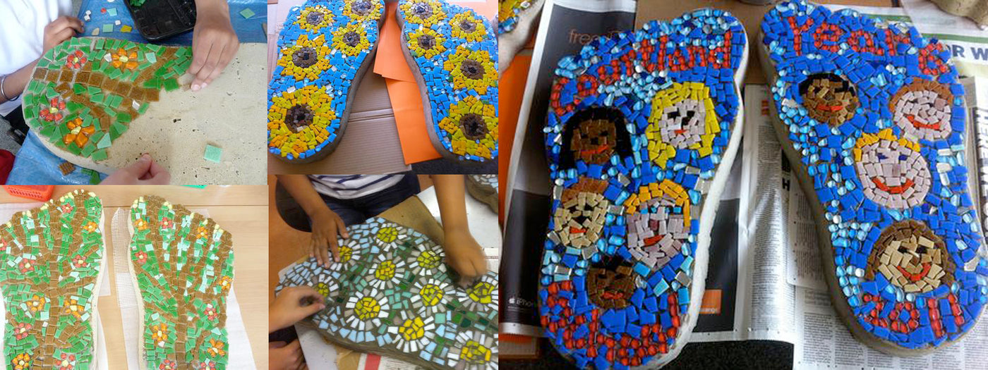 Projects have included welcome signs, school plaques, a tree of life, ground mosaics and the construction of 12 pairs of giant mosaic concrete stepping stone feet.