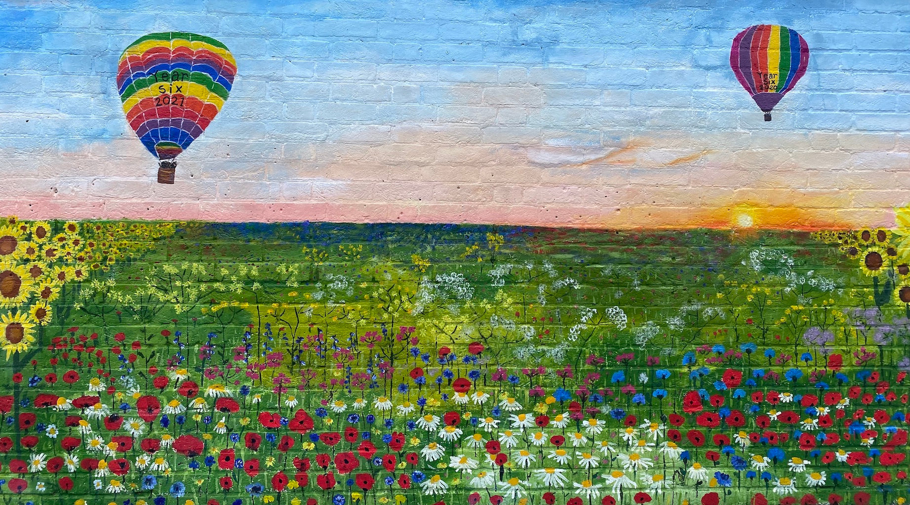A six metre long mural that we created after the school closures due to Covid, it depicts a beautiful meadow with two rainbow hot air balloons flying overhead. The hot balloon labelled 2020 was created to remember the class that did not get to do their own project because of the pandemic.